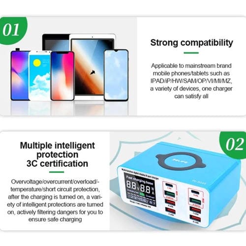 1. 1 + 8 carga inteligente, carga inalámbrica / QC3.0 / PD / interfaz USB, puede admitir la carga simultánea de 9 dispositivos digitales para usar