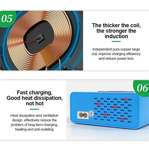 6. Bobina más gruesa, más fuerte es la inducción, bobina de cobre puro independiente, mejora la eficiencia de carga, reduce la pérdida de energía.