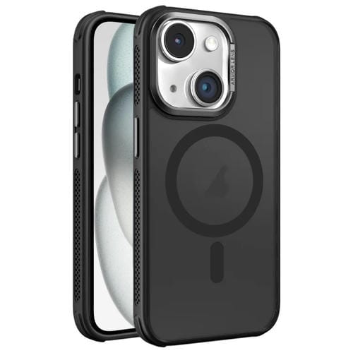 Estuche para teléfono Magsafe iPhone 15 Plus con marco de Lente de metal esmerilado y piel con enfriamiento lateral (Negro)