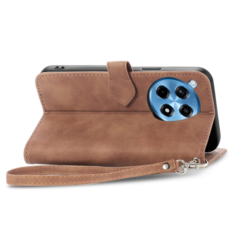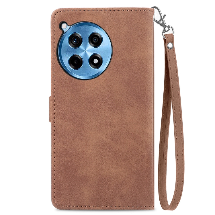 Funda de Cuero para OnePlus Ace 3 Pro con Cremallera y Diseño de Flores en Relieve (Marrón)