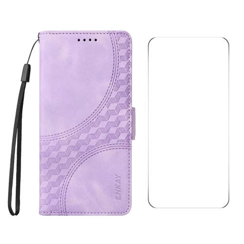 Funda de Cuero Enkay para iPhone 16 con Estampado de Rombos y Estrellas y Película Protectora (Morado)