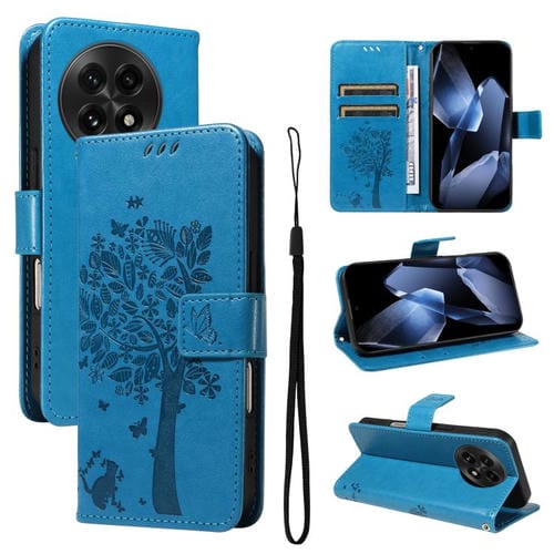 Funda de Cuero con Tapa para OnePlus 13 con Patrón En Relieve Árbol y Gato (Azul)