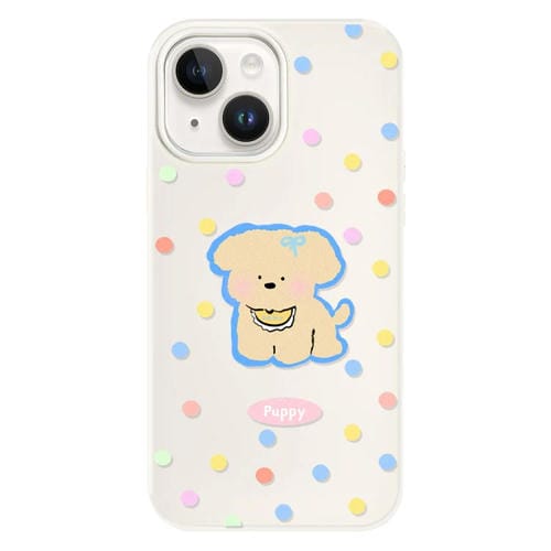 Funda híbrida TPU y PC iPhone 15 Plus con Tacto Sedoso (Cachorro Amarillo y Blanco)