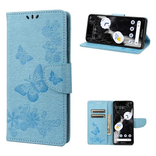 Estuche para Google Pixel 7A de Cuero con Tapa Horizontal en Relieve de Mariposa (Azul)
