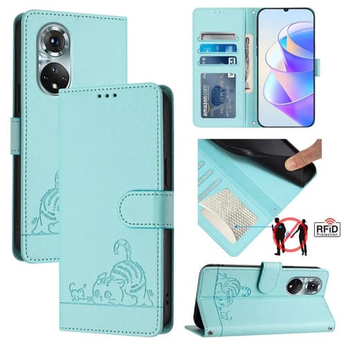 Funda para Huawei Nova 9 Cat Rat de Cuero Rfid con Patrón En Relieve y Cordón (Verde Menta)