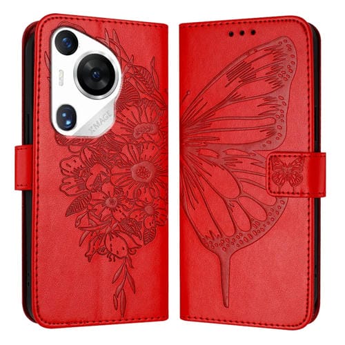 Funda de Cuero para Huawei Pura 70 Pro con Mariposa en Relieve (Rojo)