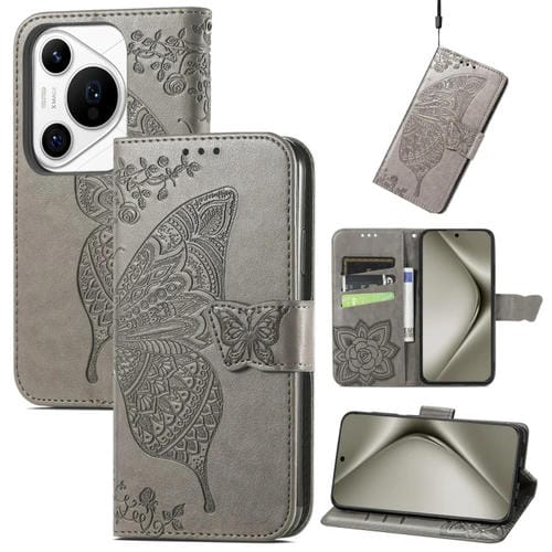 Funda para Huawei Pura 70 Pro de Cuero con Relieve Flor y Mariposa (Gris)