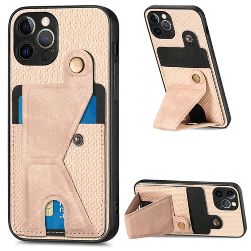 Funda para teléfono iPhone 12 Pro Max Carbon Fiber Wallet Flip Card con Soporte en forma de K (Caqui)