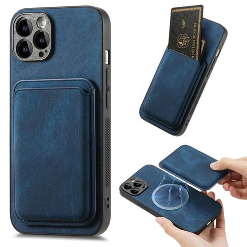 Funda de teléfono para iPhone 12 Pro Max magnética con bolsa de tarjeta de cuero retro (Azul)