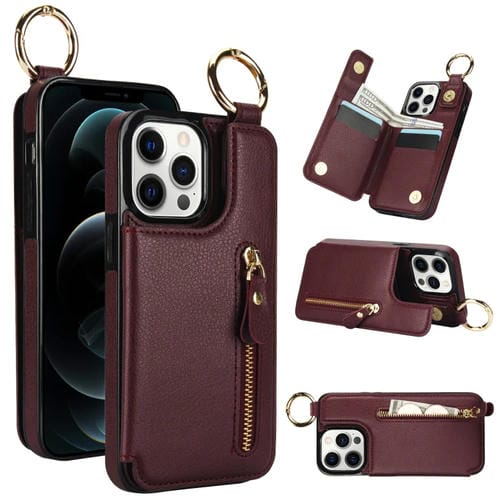 Funda para Teléfono iPhone 12 Pro Max Bolsa para Tarjetas Doble Hebilla Cremallera Textura Litchi (Rojo Granate)
