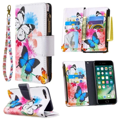 Funda de Cuero para iPhone 8 Plus y 7 Plus con Tapa Horizontal, Soporte, Ranuras para Tarjetas y Billetera (Dos Mariposas)