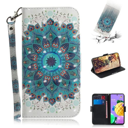 Funda de Cuero Abatible Horizontal para LG Q52 con Dibujo 3D, Soporte, Ranuras y Cordón (Corona de Pavo Real)
