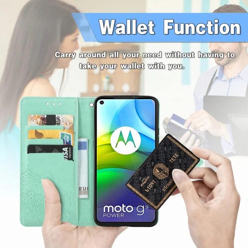 Para Motorola G9 Power Mandala Flower Flower Horizontal Flip Funda de cuero con soporte y tragamonedas de tres tarjetas y billetera y cordón (verde)