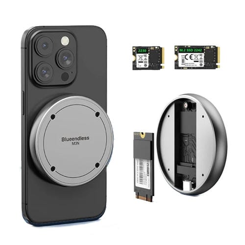 La Carcasa magnética Blueendless M3N está diseñada para alojar discos duros SSD M.2 en formatos 2230 y 2242 con protocolo NVMe, ofreciendo una solución compacta y eficiente para ampliar la capacidad de Almacenamiento. Compatible con una amplia variedad de dispositivos como Teléfonos Móviles, incluyendo modelos como iPhone 15 Pro y Pro Max, así como Computadoras Portátiles, iPad Pro, consolas Steam Deck, PS5 y XBOX, esta Carcasa permite la Conexión mediante interfaz USB 3.2 Gen 2 Tipo C con una velocidad de transferencia de hasta 10 Gbps. Su estructura metálica de aleación de aluminio proporciona protección contra golpes y caídas, mientras que el diseño magnético facilita una fijación segura y estable del SSD. Con un perfil ultradelgado de 11,1 mm, se integra perfectamente sin interferir con la Cámara del Móvil, ideal para usuarios que requieren Almacenamiento externo rápido y fiable para archivos de gran tamaño como vídeos 4K ProRes.