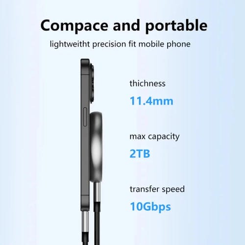 - Interfaz USB 3.2 Gen 2 Tipo C con velocidad de hasta 10 Gbps; expansión máxima de 2TB; dimensiones 69,5 x 69 x 11,4 mm; compatible con Mac OS, Windows, Linux y Android