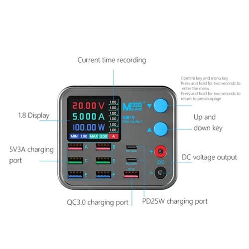 El Cargador MultiPuerto Maant Dianba No.1 Pro es una fuente de Alimentación avanzada diseñada para ofrecer una solución integral de Carga para múltiples dispositivos electrónicos. Equipado con 9 Puertos, incluyendo dos Puertos PD de 25 W, un Puerto QC3.0 y seis Puertos de Carga rápida de 3 A, además de una Carga Inalámbrica de 10 W, este Cargador permite alimentar smartphones, tabletas, Computadoras, Relojes inteligentes y Auriculares simultáneamente. Cuenta con un enchufe europeo y una Pantalla Digital a color de 1.8 pulgadas que muestra en tiempo real el estado de Carga y los parámetros eléctricos, facilitando un control preciso y seguro. Su voltaje de salida es ajustable entre 0-20 V con alta precisión, incorporando un chip de gestión inteligente que identifica automáticamente los dispositivos conectados para optimizar la Carga sin dañar las Baterías. Su diseño incluye un Ventilador de enfriamiento y protección de 8 capas para garantizar la seguridad durante la operación.