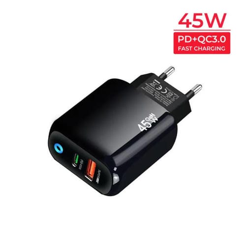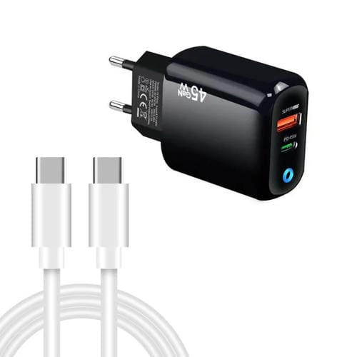 Cargador TE-PD45 GaN 45 W PD3.0/Tipo C + USB 3.0 con cable de datos tipo C a tipo C, enchufe UE (negro)