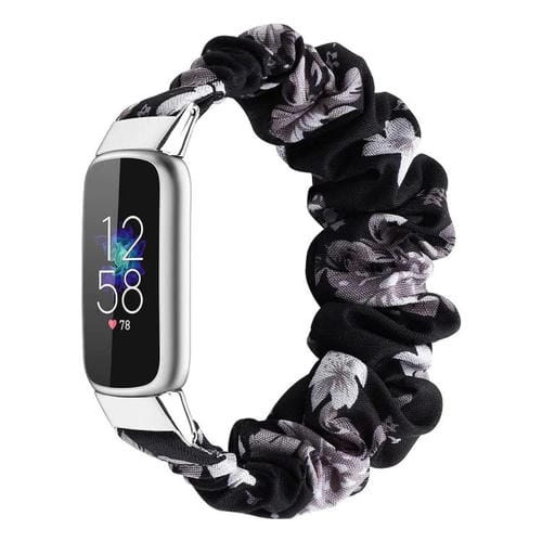 Correa elástica de poliéster xDfind con diseño de corona para Fitbit Luxe, talla L (fondo negro, flores grises)