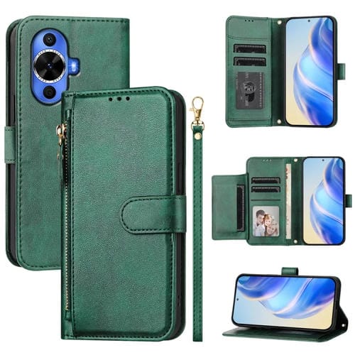 Funda de Cuero con Cremallera y Ranuras para Tarjetas para Huawei Nova 12S 4G (Verde)