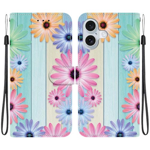 Funda de Cuero para iPhone 16 Plus con Dibujo de Colores y Textura de Cristal (Girasoles)
