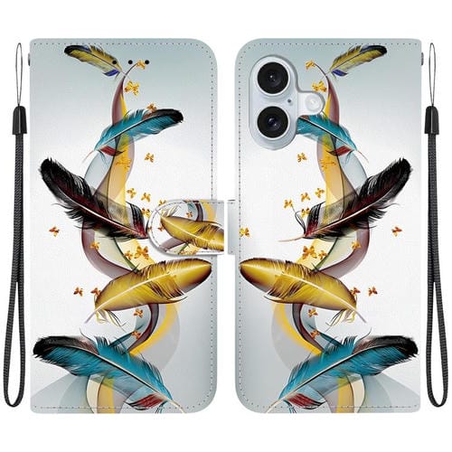 Funda de Cuero para iPhone 16 Plus con Dibujo de Colores y Textura de Cristal (Plumas de Mariposa Doradas)