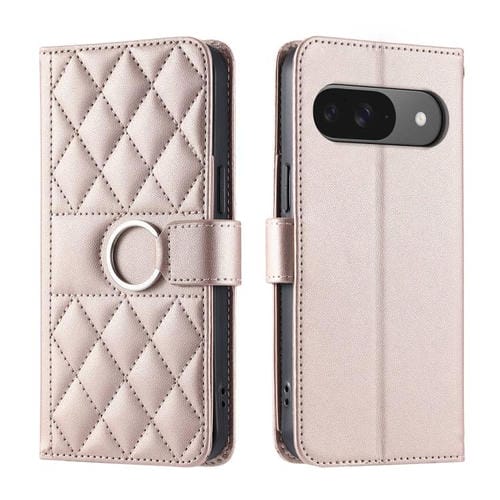Funda de Cuero con Diseño Rómbico y Hebilla para Google Pixel 9/9 Pro (Oro Rosa)