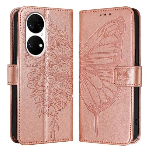 Funda de Cuero para Huawei P50 Pro con Mariposa en Relieve (Oro Rosa)