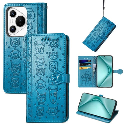 Funda para Huawei Pura 70 Pro+ de Cuero con Relieve de Perro y Gato (Azul)