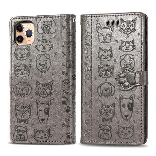 Estuche para iPhone 11 Pro Max Cute Cat And Dog Cuero PU con Tapa Horizontal En Relieve Soporte Ranura Tarjeta Billetera Cordón (Gris)