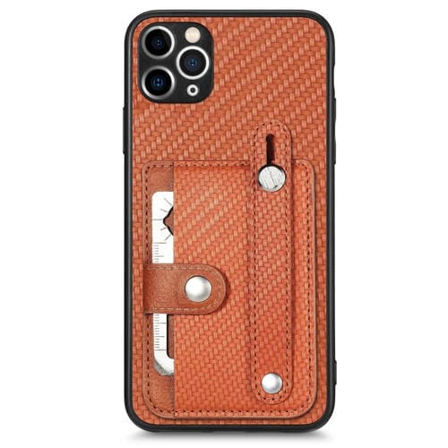 Funda para iPhone 11 Pro Max Wristband Kickstand Card Wallet Back Cover con Tool Knife (Marrón)