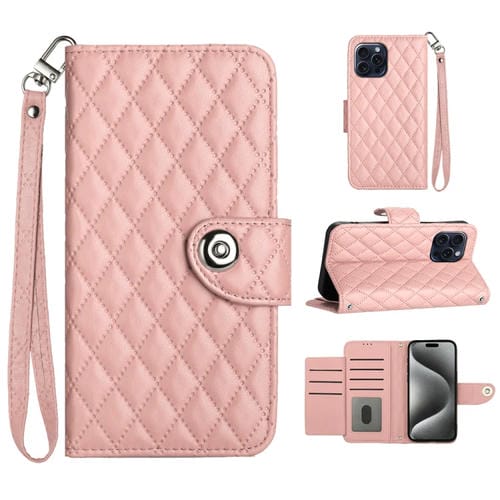 Funda para Teléfono iPhone 14 Pro Max con Tapa de Cuero Textura Rómbica y Cordón (Rosa Coral)