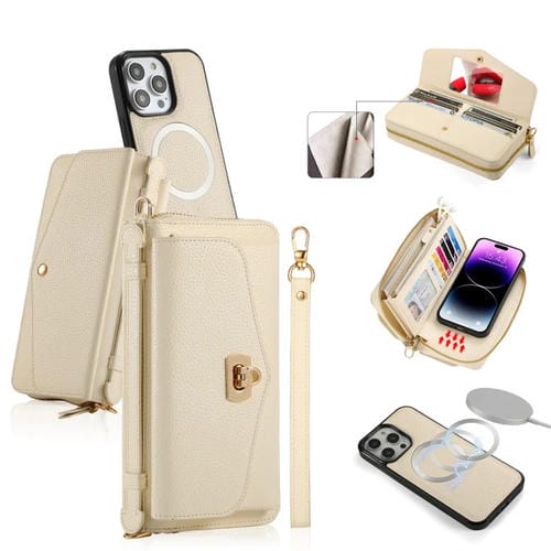 Estuche para Teléfono iPhone 14 Pro Max Magsafe Crossbody con Billetera y Cremallera de Cuero Litchi (Blanco)