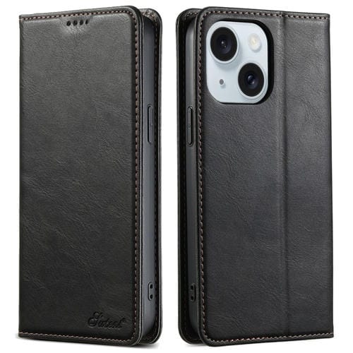 Funda de Cuero Suteni J02 para iPhone 15 Plus con Billetera de Cera de Aceite (Negro)