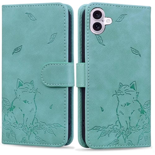 Funda para Teléfono iPhone 16 Plus Cuero Relieve Gato Lindo (Verde)