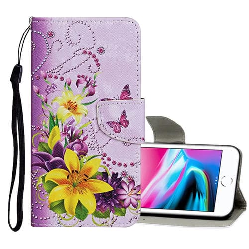 Estuche de Cuero Abatible Horizontal para iPhone 8/7 con Patrón Mariposa de Flores Amarillas, Soporte, Ranuras para Tarjetas y Billetera