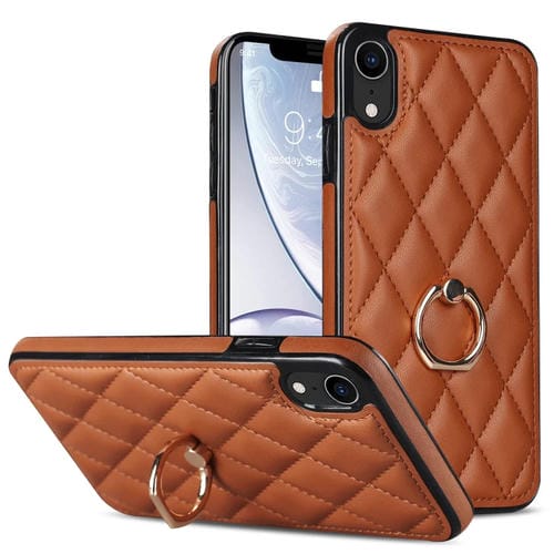 Funda para teléfono Rhombic para iPhone Xr PU Cuero con Soporte para Anillo (Marrón)