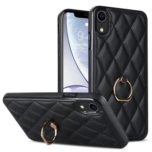 Funda para iPhone Xr Rhombic PU Cuero con Soporte para Anillo (Negro)