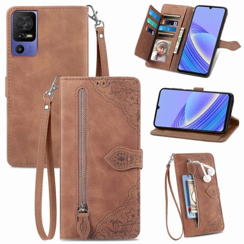 Estuche para TCL 40 SE de Cuero con Cremallera y Flores en Relieve (Marrón)