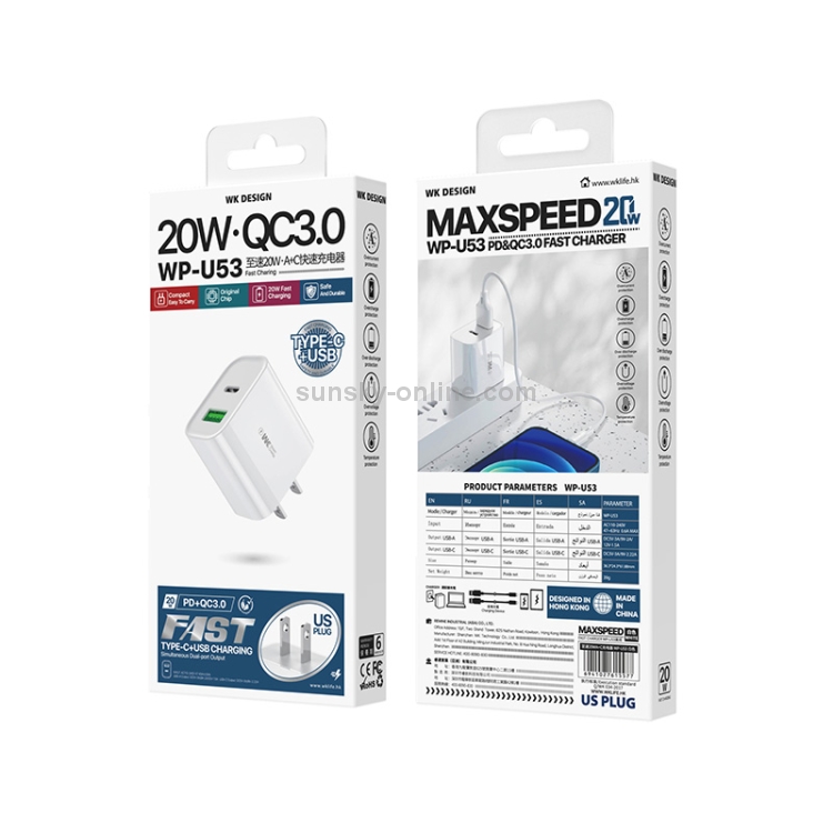 Cargador Wk Wp-U53 20W Usb Tipo-C Maxspeed Pd Cargador Rápido (Enchufe de Ee. Uu.)