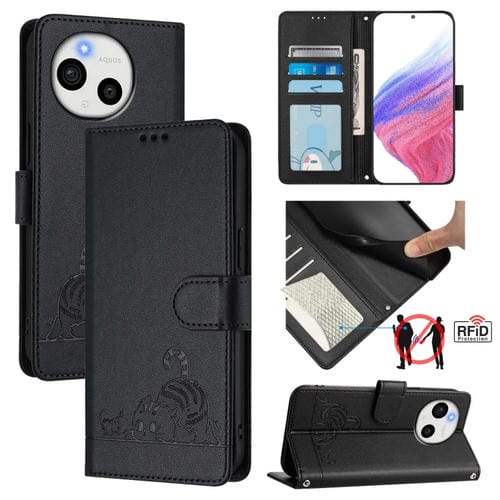 Funda de Cuero Rfid para Sharp Aquos Sense9 Plus con Estampado de Rata y Gato en Relieve y Cordón (Negro)