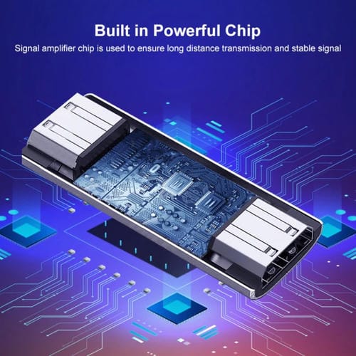 Este Adaptador amplifica la Señal para permitir extensiones de hasta 30 metros sin degradación significativa. -