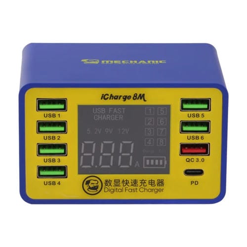 El Mecánico Icharge 8M QC 3.0 es un Cargador USB inteligente diseñado para ofrecer una solución eficiente y segura en la Carga de múltiples dispositivos electrónicos simultáneamente. Equipado con tecnología de Carga rápida Quick Charge 3.0 y Soporte para Power Delivery de 18W, este Cargador es compatible con una amplia gama de dispositivos, incluyendo iPad, iPhone, Huawei, Samsung, OPPO, VIVO, Xiaomi y otros Teléfonos Móviles y tabletas. Su diseño compacto y Portátil cuenta con un enchufe de tipo UE y una Pantalla LCD que muestra información relevante durante la Carga. Además, incorpora ocho Puertos USB (cinco Puertos estándar 5V, un Puerto QC 3.0 y un Puerto PD 18W) que permiten la Carga simultánea de hasta ocho dispositivos, optimizando el tiempo y la eficiencia energética.