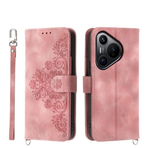 Funda de Cuero para Huawei Pura 70 con Billetera, Relieve y Flores (Rosa)