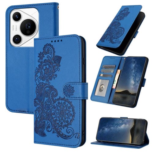 Funda para Huawei Pura 70 Pro/70 Pro+ de Cuero con Tapa y Relieve de Flor Datura (Azul)