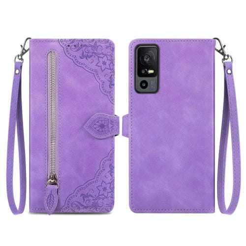 Funda de Cuero para TCL 40 Xe con Cremallera y Flores en Relieve (Púrpura)